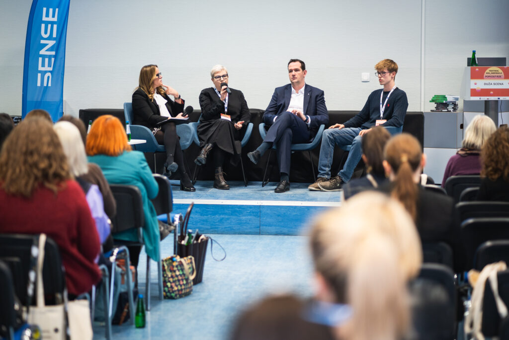 Następnie można było posłuchać inspirującej, międzypokoleniowej rozmowy prowadzonej przez Zytę Czechowską z udziałem Dr Igora Bykowskiego – Wielkopolskiego Kuratora Oświaty, Olafa Śramkowskiego z Młodzieżowej Rady Miasta Poznania, Ewy Radanowicz – Liderki od lat zmieniającej polską edukację. Była to rewelacyjna dyskusja o odpowiedzialności i podejściu do zmiany, słowa panelistów wywoływały ożywione reakcje wśród słuchaczy.