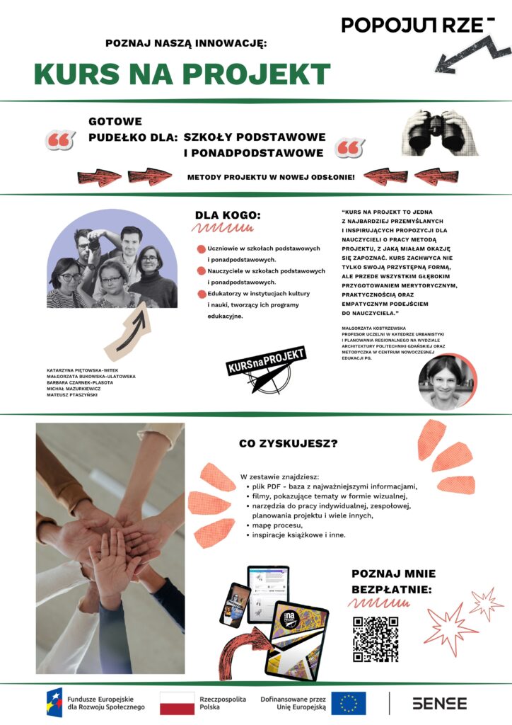 Chcemy, by „KURS na PROJEKT” stał się wygodnym, bezpłatnym narzędziem, które dodaje odwagi i inspiruje do działania – zarówno tych, którzy dopiero zaczynają przygodę z metodą projektu, jak i doświadczonych praktyków pragnących rozwinąć swoje kompetencje. Wierzymy, że dzięki temu przyczynimy się do realnej zmiany w polskiej szkole i zachęcimy wiele osób do odkrywania pełnego potencjału metody projektu.